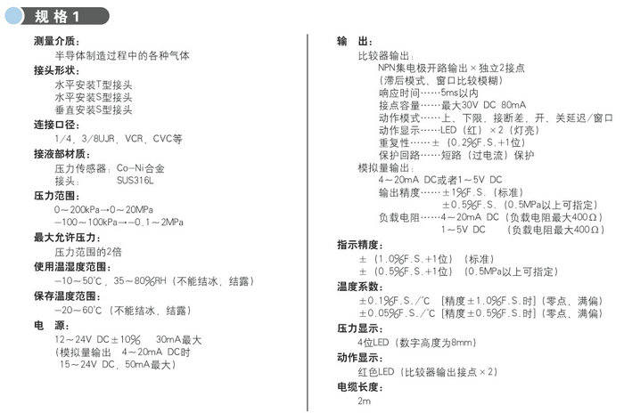 傳感器材質為CO-NI合金,連接部材質為SUS316,有卓越的耐腐蝕性和氣密性; 配備清晰易讀的大型LED顯示屏,顯示部是縱向或者橫向可選; 循環檢測功能使得檢測工作更快的完成,縮放比例功能和零點調整功能解決了調節的麻煩。 分為水平和垂直兩種安裝方式,接頭種類豐富。